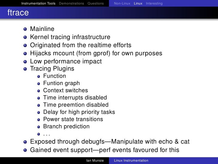 Numerous technologies exist for profiling and tracing live Linux systems - from the traditional and straight forward gProf and strace to the more elaborate SystemTap, oProfile and the Linux Trace Toolkit. Very recently some new technologies, perf events and ftrace, have appeared that can already largely take the place of these traditional tools and have gained mainline acceptance in the Linux community - meaning that they will become more and more relevant in the future and are already being used to shed light on real world performance issues.