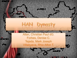 1. 1. HAN Dynasty<br />Allan, Christian Paul dG.<br />Forbes, Denise C.<br />Tejada, Mark Joseph<br />Villanueva, RhioAlfon T.<br />