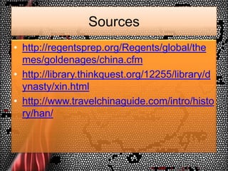 13. 13. Sources<br />http://regentsprep.org/Regents/global/themes/goldenages/china.cfm<br />http://library.thinkquest.org/12255/library/dynasty/xin.html<br />http://www.travelchinaguide.com/intro/history/han/<br />