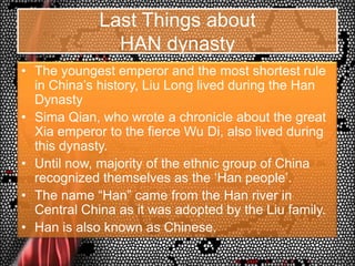 14. 14. Last Things about HAN dynasty<br />The youngest emperor and the most shortest rule in China’s history, Liu Long lived during the Han Dynasty<br />SimaQian, who wrote a chronicle about the great Xia emperor to the fierce Wu Di, also lived during this dynasty.<br />Until now, majority of the ethnic group of China recognized themselves as the ‘Han people’.<br />The name “Han” came from the Han river in Central China as it was adopted by the Liu family.<br />Han is also known as Chinese.<br />