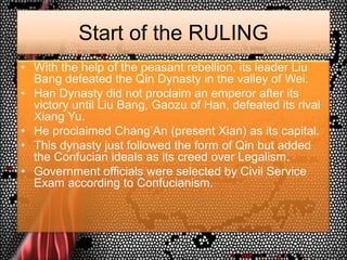 3. 3. Start of the RULING<br />With the help of the peasant rebellion, its leader Liu Bang defeated the Qin Dynasty in the valley of Wei.<br />Han Dynasty did not proclaim an emperor after its victory until Liu Bang, Gaozu of Han, defeated its rival Xiang Yu.<br />He proclaimed Chang’An (present Xian) as its capital.<br />This dynasty just followed the form of Qin but added the Confucian ideals as its creed over Legalism.<br />Government officials were selected by Civil Service Exam according to Confucianism.<br />