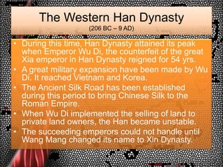 5. 5. The Western Han Dynasty(206 BC – 9 AD)<br />During this time, Han Dynasty attained its peak when Emperor Wu Di, the counterfeit of the great Xia emperor in Han Dynasty reigned for 54 yrs.<br />A great military expansion have been made by Wu Di. It reached Vietnam and Korea.<br />The Ancient Silk Road has been established during this period to bring Chinese Silk to the Roman Empire.<br />When Wu Di implemented the selling of land to private land owners, the Han became unstable.<br />The succeeding emperors could not handle until Wang Mang changed its name to Xin Dynasty.<br />