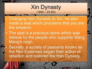 7. 7. Xin Dynasty( 9AD – 23 AD)<br />Changing Han Dynasty to Xin, he also made a seal which proclaims that you are the emperor.<br />The seal is a precious stone which was believe by the people who supports Wang Mang’s reign.<br />Secretly, a society of peasants known as the Red Eyebrows began their action of rebellion and restored the Han Dynasty.<br />
