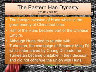 8. 8. The Eastern Han Dynasty( 25AD - 220 AD)<br />The foreign invasion of Huns which is the great enemy of China that time.<br />Half of the Huns became part of the Chinese Empire.<br />Although Huns tried to reunite with Turkestan, the campaign of Emperor Ming Di which later saved by Chang Di made the Turkestan became unstable in their decision and did not continue the union with Huns.<br />