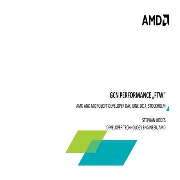 78. 78. CONCLUSIONS GCN ARCHITECTURE TAKEAWAYS CONTINUED … ‒GCN generally simplifies your life as a programmer ‒Don’t: fret too much about instruction grouping, or vectorization ‒Do: Think about GPR utilization & LDS usage (impacts max # of wavefronts) ‒Do: Think about thread/CU locality when you structure your algorithm ‒Do: Exploit the low-latency 4-CU Shared 16KB Scalar L1 Data Cache (K$) ‒Do: Pack shader inputs and outputs – aim to be IO/bandwidth thin! ‒ Pack PS exports into non-blended 64-bit format for optimal ROP utilization ‒ But, remember that 32-bit formats still use less bandwidth ‒ Keep geometry (HS, VS, GS, DS) stage IO under 4 float4 (ideally less! ) ‒Unlimited number of addressable constants/resources ‒N constants aren’t free anymore – each consume resources, use sparingly! ‒Compute is the future – exploit its power for GPGPU work & graphics! 80 | A CRASH COURSE: THE AMD GCN ARCHITECTURE | JANUARY 31, 2014 | APU13