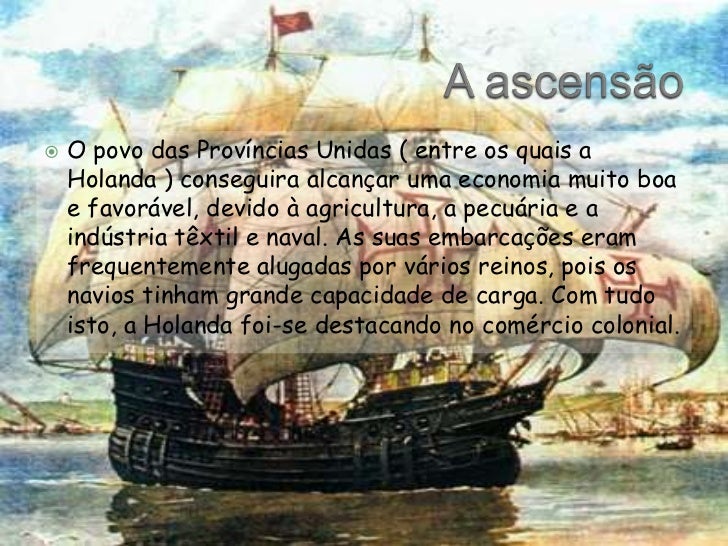 3. 3. A ascensão<br />O povo das Províncias Unidas ( entre os quaisa Holanda ) conseguira alcançar uma economia muito boa e favorável, devido à agricultura, a pecuária e a indústria têxtil e naval. As suas embarcações eram frequentemente alugadas por vários reinos, pois os navios tinham grande capacidade de carga. Com tudo isto, a Holanda foi-se destacando no comércio colonial.<br />