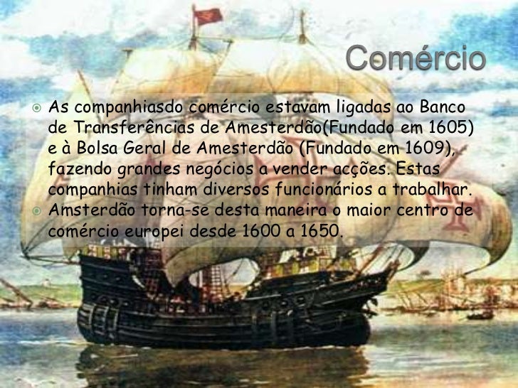 5. 5. Comércio<br />As companhiasdo comércio estavam ligadas ao Banco de Transferências de Amesterdão(Fundado em 1605) e à Bolsa Geral de Amesterdão (Fundado em 1609), fazendo grandes negócios a vender acções. Estas companhias tinham diversos funcionários a trabalhar.<br />Amsterdão torna-se desta maneira o maior centro de comércio europei desde 1600 a 1650.<br />