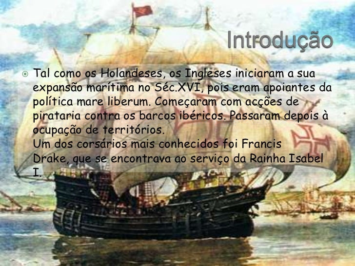 7. 7. Introdução<br />Tal como os Holandeses, os Ingleses iniciaram a sua expansão marítima no Séc.XVI, pois eram apoiantes da política mareliberum. Começaram com acções de pirataria contra os barcos ibéricos. Passaram depois à ocupação de territórios.<br /> Um dos corsários mais conhecidos foi Francis Drake, que se encontrava ao serviço da Rainha Isabel I.<br />