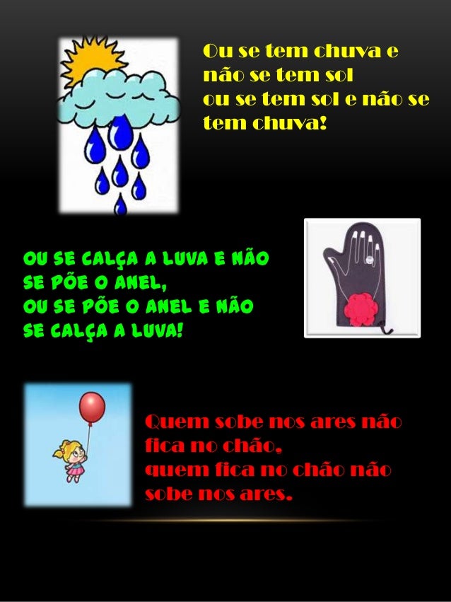 2. 2. Ou se tem chuva e não se tem sol ou se tem sol e não se tem chuva! Ou se calça a luva e não se põe o anel, ou se põe o anel e não se calça a luva! Quem sobe nos ares não fica no chão, quem fica no chão não sobe nos ares.