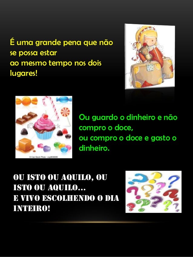 3. 3. É uma grande pena que não se possa estar ao mesmo tempo nos dois lugares! Ou guardo o dinheiro e não compro o doce, ou compro o doce e gasto o dinheiro. Ou isto ou aquilo, ou isto ou aquilo... e vivo escolhendo o dia inteiro!
