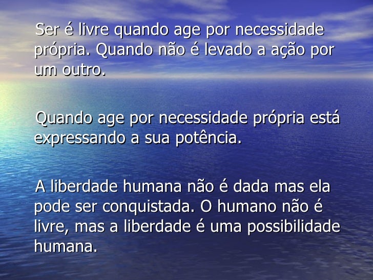 11. 11. <ul><li>Ser é livre quando age por necessidade própria. Quando não é levado a ação por um outro. </li></ul><ul><li>Quando age por necessidade própria está expressando a sua potência. </li></ul><ul><li>A liberdade humana não é dada mas ela pode ser conquistada. O humano não é livre, mas a liberdade é uma possibilidade humana.  </li></ul>