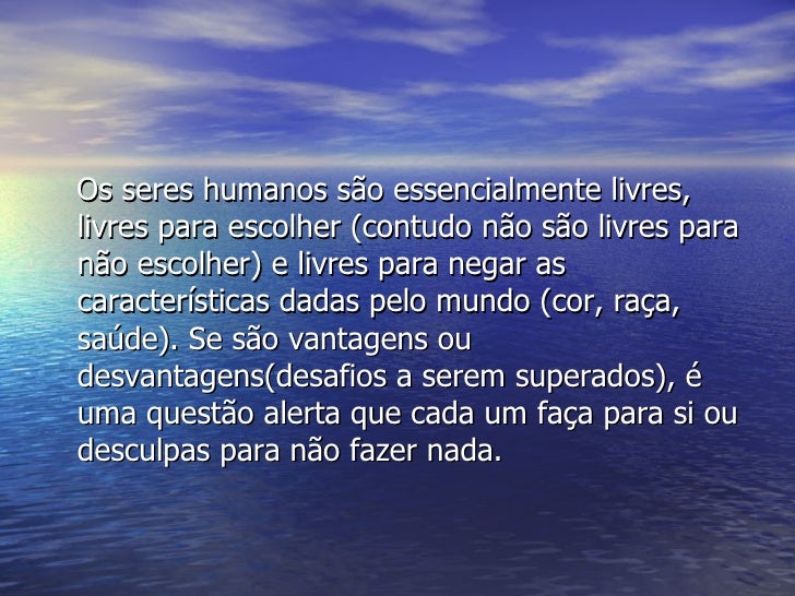 17. 17. <ul><li>Os seres humanos são essencialmente livres, livres para escolher (contudo não são livres para não escolher) e livres para negar as características dadas pelo mundo (cor, raça, saúde). Se são vantagens ou desvantagens(desafios a serem superados), é uma questão alerta que cada um faça para si ou desculpas para não fazer nada. </li></ul>