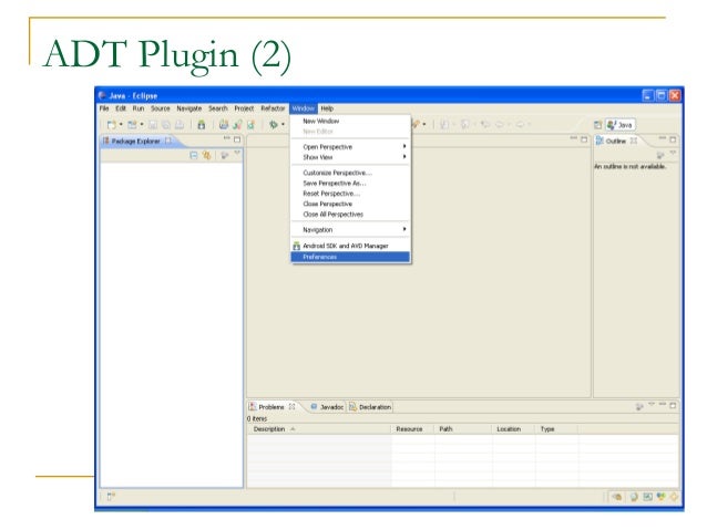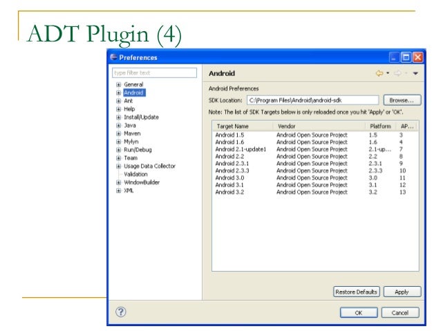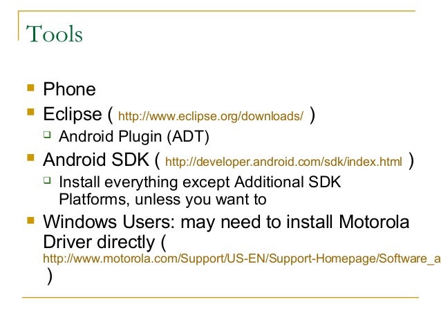 3. 3. Tools  Phone  Eclipse ( http://www.eclipse.org/downloads/ )  Android Plugin (ADT)  Android SDK ( http://developer.android.com/sdk/index.html )  Install everything except Additional SDK Platforms, unless you want to  Windows Users: may need to install Motorola Driver directly ( http://www.motorola.com/Support/US-EN/Support-Homepage/Software_an )