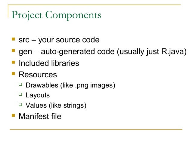 13. 13. Project Components  src – your source code  gen – auto-generated code (usually just R.java)  Included libraries  Resources  Drawables (like .png images)  Layouts  Values (like strings)  Manifest file