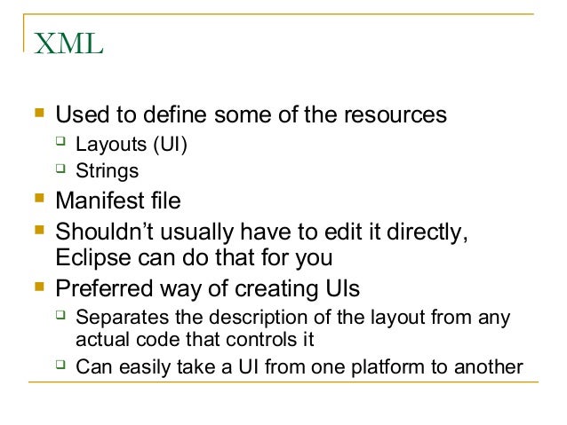 14. 14. XML  Used to define some of the resources  Layouts (UI)  Strings  Manifest file  Shouldn’t usually have to edit it directly, Eclipse can do that for you  Preferred way of creating UIs  Separates the description of the layout from any actual code that controls it  Can easily take a UI from one platform to another