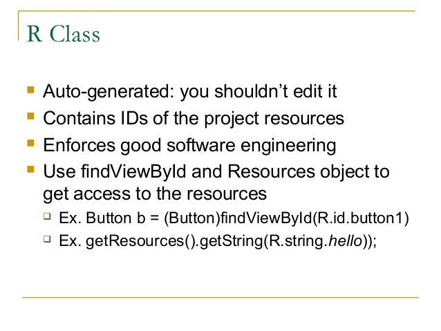 15. 15. R Class  Auto-generated: you shouldn’t edit it  Contains IDs of the project resources  Enforces good software engineering  Use findViewById and Resources object to get access to the resources  Ex. Button b = (Button)findViewById(R.id.button1)  Ex. getResources().getString(R.string.hello));