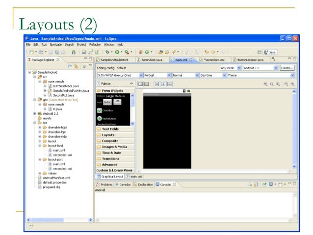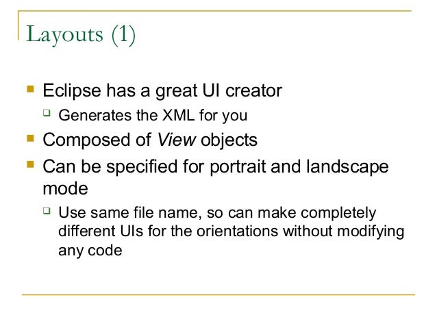 16. 16. Layouts (1)  Eclipse has a great UI creator  Generates the XML for you  Composed of View objects  Can be specified for portrait and landscape mode  Use same file name, so can make completely different UIs for the orientations without modifying any code