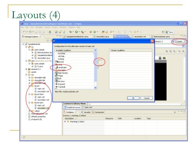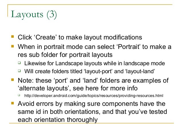 18. 18. Layouts (3)  Click ‘Create’ to make layout modifications  When in portrait mode can select ‘Portrait’ to make a res sub folder for portrait layouts  Likewise for Landscape layouts while in landscape mode  Will create folders titled ‘layout-port’ and ‘layout-land’  Note: these ‘port’ and ‘land’ folders are examples of ‘alternate layouts’, see here for more info  http://developer.android.com/guide/topics/resources/providing-resources.html  Avoid errors by making sure components have the same id in both orientations, and that you’ve tested each orientation thoroughly