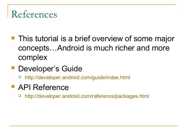 2. 2. References  This tutorial is a brief overview of some major concepts…Android is much richer and more complex  Developer’s Guide  http://developer.android.com/guide/index.html  API Reference  http://developer.android.com/reference/packages.html