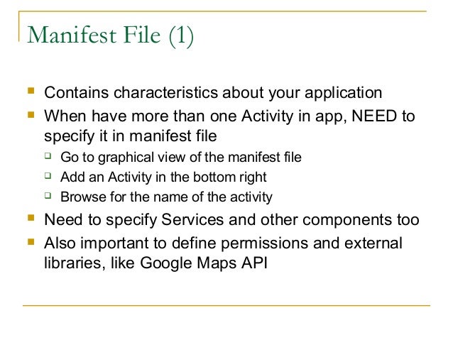 21. 21. Manifest File (1)  Contains characteristics about your application  When have more than one Activity in app, NEED to specify it in manifest file  Go to graphical view of the manifest file  Add an Activity in the bottom right  Browse for the name of the activity  Need to specify Services and other components too  Also important to define permissions and external libraries, like Google Maps API