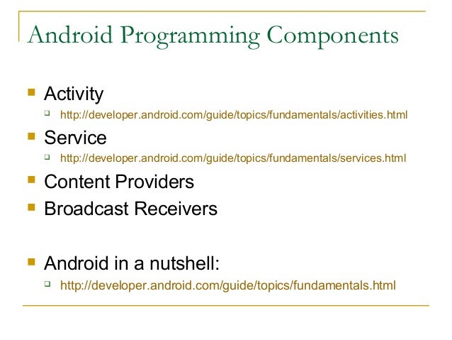 23. 23. Android Programming Components  Activity  http://developer.android.com/guide/topics/fundamentals/activities.html  Service  http://developer.android.com/guide/topics/fundamentals/services.html  Content Providers  Broadcast Receivers  Android in a nutshell:  http://developer.android.com/guide/topics/fundamentals.html