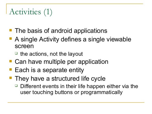 24. 24. Activities (1)  The basis of android applications  A single Activity defines a single viewable screen  the actions, not the layout  Can have multiple per application  Each is a separate entity  They have a structured life cycle  Different events in their life happen either via the user touching buttons or programmatically