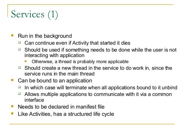 26. 26. Services (1)  Run in the background  Can continue even if Activity that started it dies  Should be used if something needs to be done while the user is not interacting with application  Otherwise, a thread is probably more applicable  Should create a new thread in the service to do work in, since the service runs in the main thread  Can be bound to an application  In which case will terminate when all applications bound to it unbind  Allows multiple applications to communicate with it via a common interface  Needs to be declared in manifest file  Like Activities, has a structured life cycle