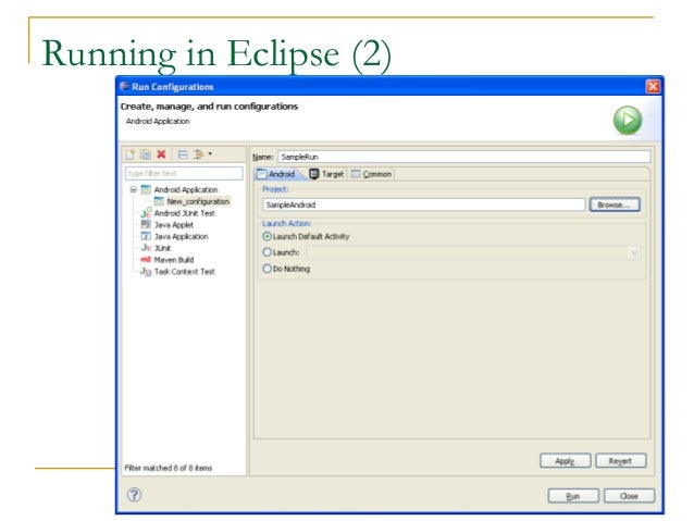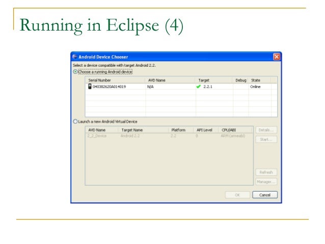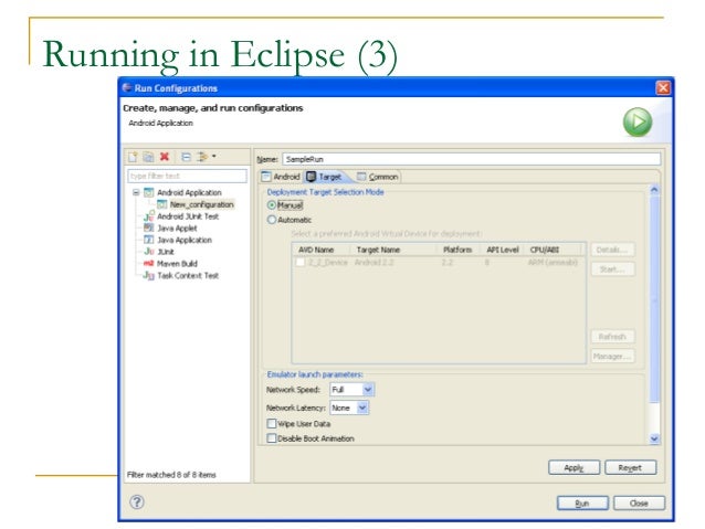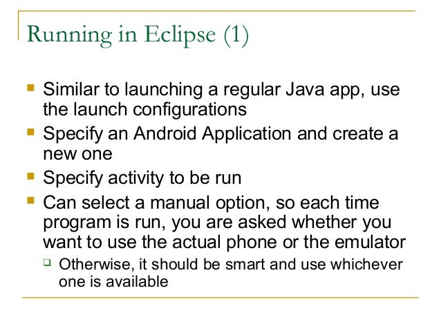 28. 28. Running in Eclipse (1)  Similar to launching a regular Java app, use the launch configurations  Specify an Android Application and create a new one  Specify activity to be run  Can select a manual option, so each time program is run, you are asked whether you want to use the actual phone or the emulator  Otherwise, it should be smart and use whichever one is available