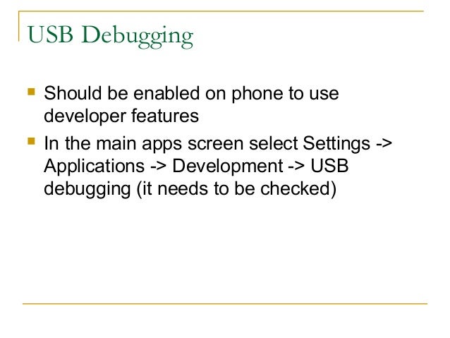 32. 32. USB Debugging  Should be enabled on phone to use developer features  In the main apps screen select Settings -> Applications -> Development -> USB debugging (it needs to be checked)