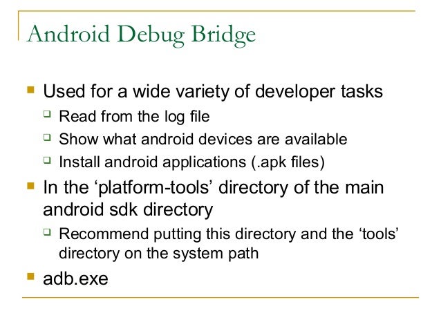 33. 33. Android Debug Bridge  Used for a wide variety of developer tasks  Read from the log file  Show what android devices are available  Install android applications (.apk files)  In the ‘platform-tools’ directory of the main android sdk directory  Recommend putting this directory and the ‘tools’ directory on the system path  adb.exe
