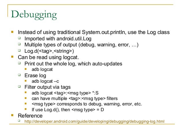 34. 34. Debugging  Instead of using traditional System.out.println, use the Log class  Imported with android.util.Log  Multiple types of output (debug, warning, error, …)  Log.d(<tag>,<string>)  Can be read using logcat.  Print out the whole log, which auto-updates  adb logcat  Erase log  adb logcat –c  Filter output via tags  adb logcat <tag>:<msg type> *:S  can have multiple <tag>:<msg type> filters  <msg type> corresponds to debug, warning, error, etc.  If use Log.d(), then <msg type> = D  Reference  http://developer.android.com/guide/developing/debugging/debugging-log.html