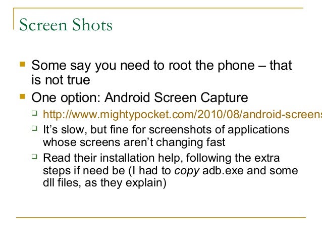 35. 35. Screen Shots  Some say you need to root the phone – that is not true  One option: Android Screen Capture  http://www.mightypocket.com/2010/08/android-screens  It’s slow, but fine for screenshots of applications whose screens aren’t changing fast  Read their installation help, following the extra steps if need be (I had to copy adb.exe and some dll files, as they explain)