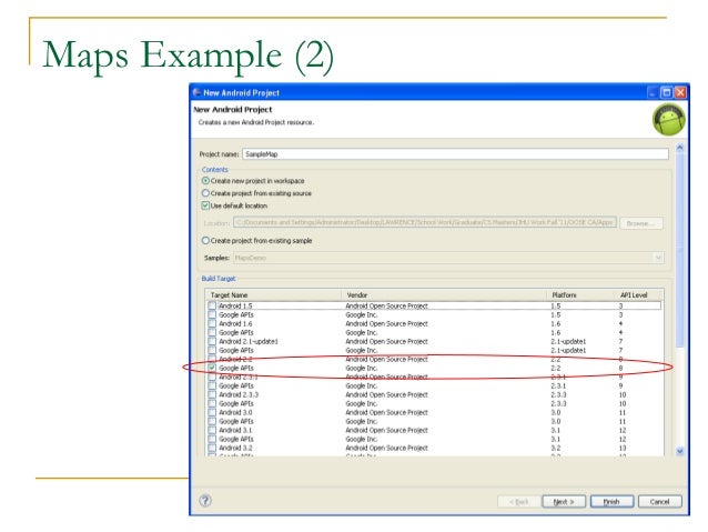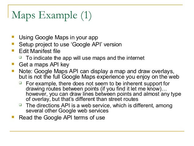 36. 36. Maps Example (1)  Using Google Maps in your app  Setup project to use ‘Google API’ version  Edit Manifest file  To indicate the app will use maps and the internet  Get a maps API key  Note: Google Maps API can display a map and draw overlays, but is not the full Google Maps experience you enjoy on the web  For example, there does not seem to be inherent support for drawing routes between points (if you find it let me know)… however, you can draw lines between points and almost any type of overlay, but that’s different than street routes  The directions API is a web service, which is different, among several other Google web services  Read the Google API terms of use