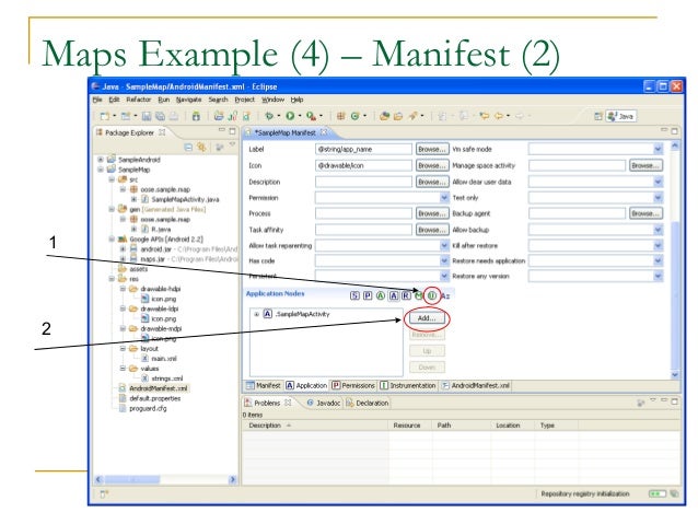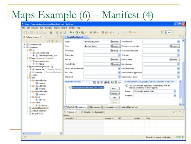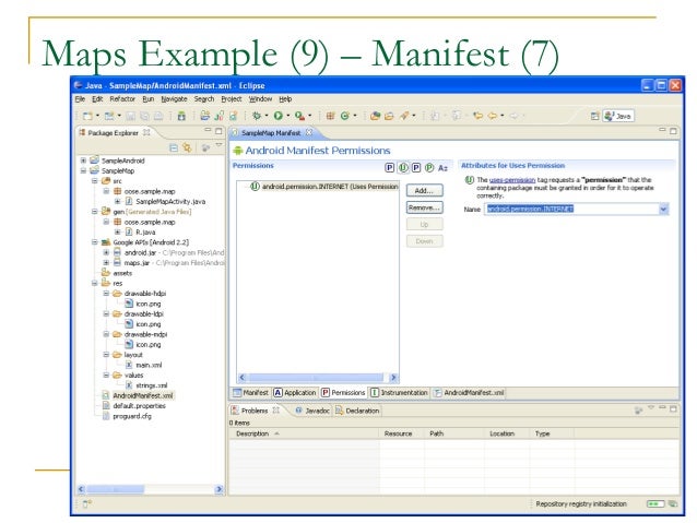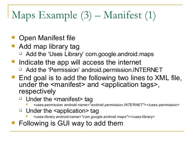 38. 38. Maps Example (3) – Manifest (1)  Open Manifest file  Add map library tag  Add the ‘Uses Library’ com.google.android.maps  Indicate the app will access the internet  Add the ‘Permission’ android.permission.lNTERNET  End goal is to add the following two lines to XML file, under the <manifest> and <application tags>, respectively  Under the <manifest> tag  <uses-permission android:name="android.permission.INTERNET"></uses-permission>  Under the <application> tag  <uses-library android:name="com.google.android.maps"></uses-library>  Following is GUI way to add them