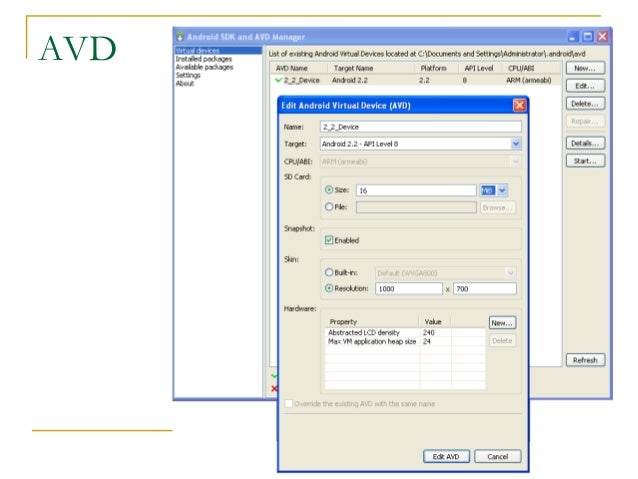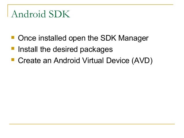 4. 4. Android SDK  Once installed open the SDK Manager  Install the desired packages  Create an Android Virtual Device (AVD)