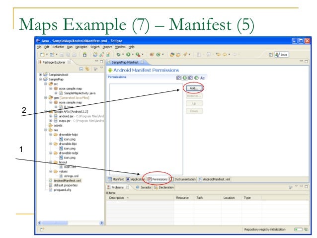 43. 43. Maps Example (8) – Manifest (6)  Select ‘Permissions’ and then ‘Add’ (last slide)  Select ‘Uses Permissions’ at this prompt  Set name to: android.permission.INTERNET and save (next slide)