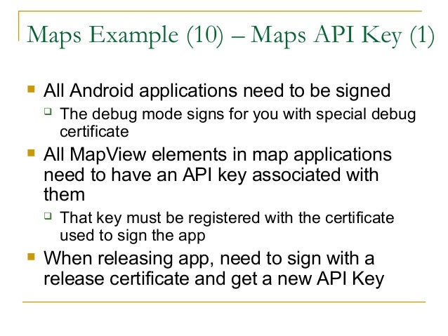45. 45. Maps Example (10) – Maps API Key (1)  All Android applications need to be signed  The debug mode signs for you with special debug certificate  All MapView elements in map applications need to have an API key associated with them  That key must be registered with the certificate used to sign the app  When releasing app, need to sign with a release certificate and get a new API Key