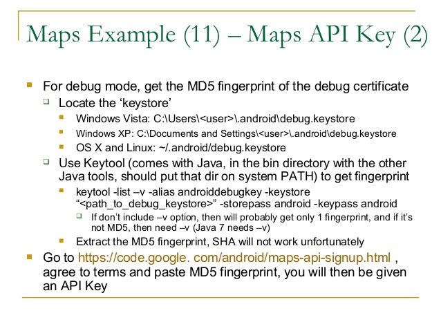 46. 46. Maps Example (11) – Maps API Key (2)  For debug mode, get the MD5 fingerprint of the debug certificate  Locate the ‘keystore’  Windows Vista: C:Users<user>.androiddebug.keystore  Windows XP: C:Documents and Settings<user>.androiddebug.keystore  OS X and Linux: ~/.android/debug.keystore  Use Keytool (comes with Java, in the bin directory with the other Java tools, should put that dir on system PATH) to get fingerprint  keytool -list –v -alias androiddebugkey -keystore “<path_to_debug_keystore>” -storepass android -keypass android  If don’t include –v option, then will probably get only 1 fingerprint, and if it’s not MD5, then need –v (Java 7 needs –v)  Extract the MD5 fingerprint, SHA will not work unfortunately  Go to https://code.google. com/android/maps-api-signup.html , agree to terms and paste MD5 fingerprint, you will then be given an API Key