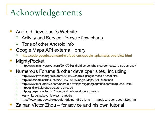 48. 48. Acknowledgements  Android Developer’s Website  Activity and Service life-cycle flow charts  Tons of other Android info  Google Maps API external library  http://code.google.com/android/add-ons/google-apis/maps-overview.html  MightyPocket  http://www.mightypocket.com/2010/08/android-screenshots-screen-capture-screen-cast/  Numerous Forums & other developer sites, including:  http://www.javacodegeeks.com/2011/02/android-google-maps-tutorial.html  http://efreedom.com/Question/1-6070968/Google-Maps-Api-Directions  http://www.mail-archive.com/android-developers@googlegroups.com/msg28487.html  http://android.bigresource.com/ threads  http://groups.google.com/group/android-developers threads  Many http://stackoverflow.com threads  http://www.anddev.org/google_driving_directions_-_mapview_overlayed-t826.html  Zainan Victor Zhou – for advice and his own tutorial
