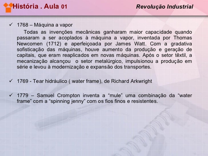 11. 11. História . Aula 01 Revolução Industrial <ul><li>1768 – Máquina a vapor </li></ul><ul><li>Todas as invenções mecânicas ganharam maior capacidade quando passaram a ser acoplados à máquina a vapor, inventada por Thomas Newcomen (1712) e aperfeiçoada por James Watt. Com a gradativa sofisticação das máquinas, houve aumento da produção e geração de capitais, que eram reaplicados em novas máquinas. Após o setor têxtil, a mecanização alcançou o setor metalúrgico, impulsionou a produção em série e levou à modernização e expansão dos transportes. </li></ul><ul><li>1769 - Tear hidráulico ( water frame), de Richard Arkwright </li></ul><ul><li>1779 – Samuel Crompton inventa a “mule” uma combinação da “water frame” com a “spinning jenny” com os fios finos e resistentes. </li></ul>