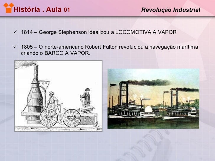 13. 13. História . Aula 01 Revolução Industrial <ul><li>1814 – George Stephenson idealizou a LOCOMOTIVA A VAPOR </li></ul><ul><li>1805 – O norte-americano Robert Fulton revoluciou a navegação marítima criando o BARCO A VAPOR. </li></ul>