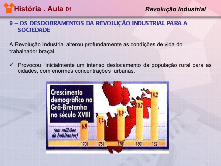 17. 17. História . Aula 01 Revolução Industrial <ul><li>9 – OS DESDOBRAMENTOS DA REVOLUÇÃO INDUSTRIAL PARA A SOCIEDADE </li></ul><ul><li>A Revolução Industrial alterou profundamente as condições de vida do </li></ul><ul><li>trabalhador braçal. </li></ul><ul><li>Provocou inicialmente um intenso deslocamento da população rural para as cidades, com enormes concentrações urbanas. </li></ul>