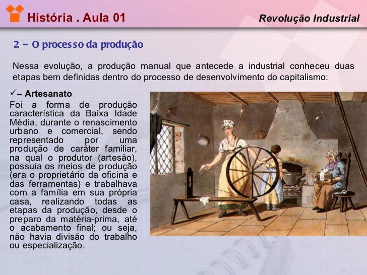 2. 2. História . Aula 01 2 – O processo da produção Revolução Industrial <ul><li>– Artesanato </li></ul><ul><li>Foi a forma de produção característica da Baixa Idade Média, durante o renascimento urbano e comercial, sendo representado por uma produção de caráter familiar, na qual o produtor (artesão), possuía os meios de produção (era o proprietário da oficina e das ferramentas) e trabalhava com a família em sua própria casa, realizando todas as etapas da produção, desde o preparo da matéria-prima, até o acabamento final; ou seja, não havia divisão do trabalho ou especialização. </li></ul>Nessa evolução, a produção manual que antecede a industrial conheceu duas etapas bem definidas dentro do processo de desenvolvimento do capitalismo: