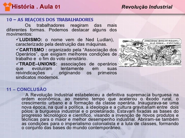 20. 20. História . Aula 01 Revolução Industrial <ul><li>11 – CONCLUSÃO </li></ul><ul><ul><li>A Revolução Industrial estabeleceu a definitiva supremacia burguesa na ordem econômica, ao mesmo tempo que acelerou o êxodo rural, o crescimento urbano e a formação da classe operária. Inaugurava-se uma nova época, na qual a política, a ideologia e a cultura gravitariam entre dois pólos: a burguesia industrial e o proletariado. Estavam fixadas as bases do progresso tecnológico e científico, visando a invenção de novos produtos e técnicas para o maior e melhor desempenho industrial. Abriram-se também as condições para o imperialismo colonialista e a luta de classes, formando o conjunto das bases do mundo contemporâneo. </li></ul></ul><ul><li>10 – AS REAÇÕES DOS TRABALHADORES </li></ul><ul><li>Os trabalhadores reagiram das mais diferentes formas. Podemos destacar alguns dos movimentos: </li></ul><ul><ul><li>LUDISMO: o nome vem de Ned Ludlan), caracterizado pela destruição das máquinas. </li></ul></ul><ul><ul><li>CARTISMO : organizado pela “Associação dos Operários”, que exigiam melhores condições de trabalho e o fim do voto censitário. </li></ul></ul><ul><ul><li>TRADE–UNIONS: associações de operários que evoluíram lentamente em suas reivindicações , originando os primeiros sindicatos modernos. </li></ul></ul>