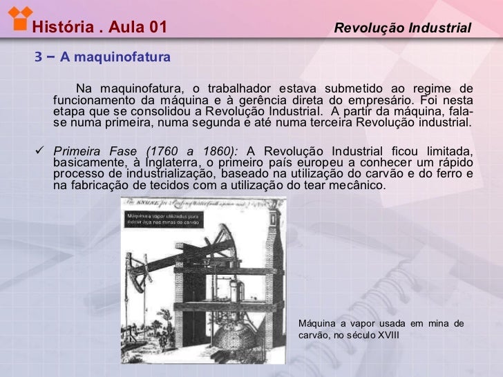 4. 4. História . Aula 01 Revolução Industrial <ul><li>3 – A maquinofatura </li></ul><ul><li>Na maquinofatura, o trabalhador estava submetido ao regime de funcionamento da máquina e à gerência direta do empresário. Foi nesta etapa que se consolidou a Revolução Industrial. A partir da máquina, fala-se numa primeira, numa segunda e até numa terceira Revolução industrial. </li></ul><ul><li>Primeira Fase (1760 a 1860): A Revolução Industrial ficou limitada, basicamente, à Inglaterra, o primeiro país europeu a conhecer um rápido processo de industrialização, baseado na utilização do carvão e do ferro e na fabricação de tecidos com a utilização do tear mecânico. </li></ul>Máquina a vapor usada em mina de carvão, no século XVIII