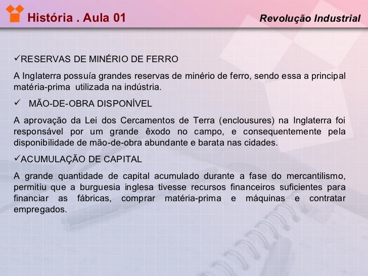 8. 8. História . Aula 01 Revolução Industrial <ul><li>RESERVAS DE MINÉRIO DE FERRO </li></ul><ul><li>A Inglaterra possuía grandes reservas de minério de ferro, sendo essa a principal matéria-prima utilizada na indústria. </li></ul><ul><li>MÃO-DE-OBRA DISPONÍVEL </li></ul><ul><li>A aprovação da Lei dos Cercamentos de Terra (enclousures) na Inglaterra foi responsável por um grande êxodo no campo, e consequentemente pela disponibilidade de mão-de-obra abundante e barata nas cidades. </li></ul><ul><li>ACUMULAÇÃO DE CAPITAL </li></ul><ul><li>A grande quantidade de capital acumulado durante a fase do mercantilismo, permitiu que a burguesia inglesa tivesse recursos financeiros suficientes para financiar as fábricas, comprar matéria-prima e máquinas e contratar empregados. </li></ul>