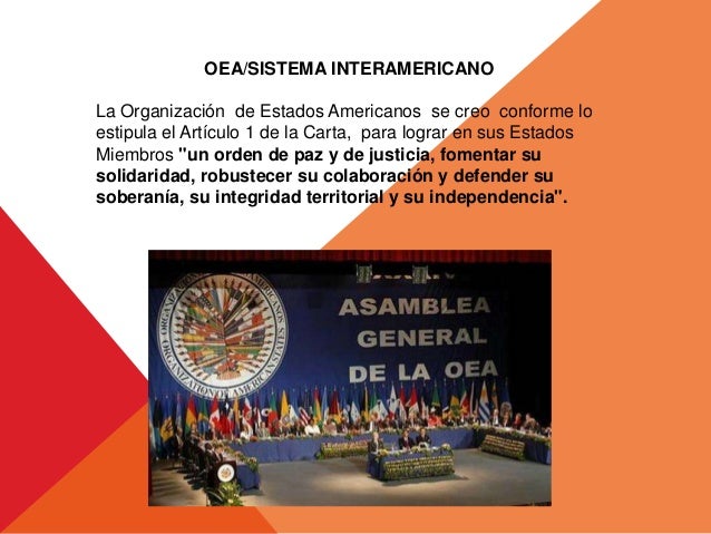 2. 2. OEA/SISTEMA INTERAMERICANO La Organización de Estados Americanos se creo conforme lo estipula el Artículo 1 de la Carta, para lograr en sus Estados Miembros "un orden de paz y de justicia, fomentar su solidaridad, robustecer su colaboración y defender su soberanía, su integridad territorial y su independencia".