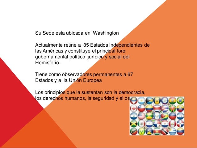 4. 4. Su Sede esta ubicada en Washington Actualmente reúne a 35 Estados independientes de las Américas y constituye el principal foro gubernamental político, jurídico y social del Hemisferio. Tiene como observadores permanentes a 67 Estados y a la Unión Europea Los principios que la sustentan son la democracia, los derechos humanos, la seguridad y el desarrollo.