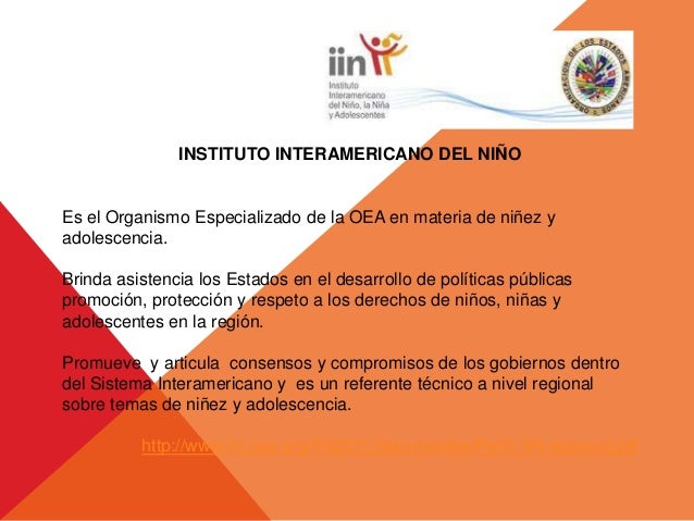 5. 5. INSTITUTO INTERAMERICANO DEL NIÑO Es el Organismo Especializado de la OEA en materia de niñez y adolescencia. Brinda asistencia los Estados en el desarrollo de políticas públicas promoción, protección y respeto a los derechos de niños, niñas y adolescentes en la región. Promueve y articula consensos y compromisos de los gobiernos dentro del Sistema Interamericano y es un referente técnico a nivel regional sobre temas de niñez y adolescencia. http://www.iin.oea.org/IIN2011/documentos/Perfil-IIN-espanol.pdf