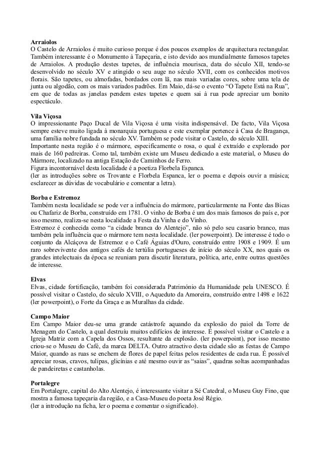 Apresentação em powerpoint sobre os principais pontos turísticos alentejanos e respectivas tradições, música relacionada com as localidades (exemplo: "Porto Côvo" e "Grândola Vila-Morena") e exemplos de trabalhos de pesquisa para os alunos. Acompanhada de guião de apresentação oral.